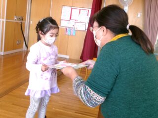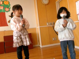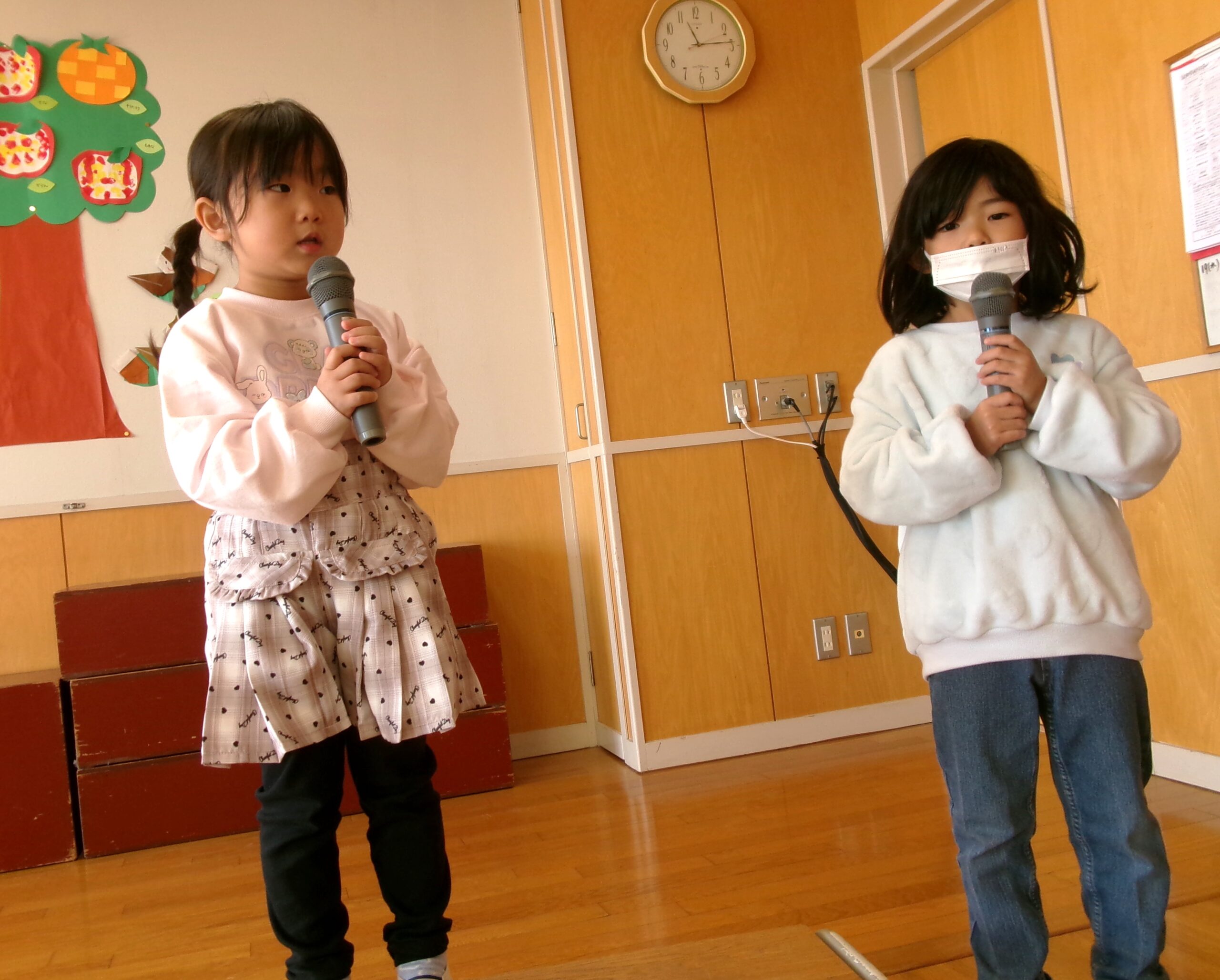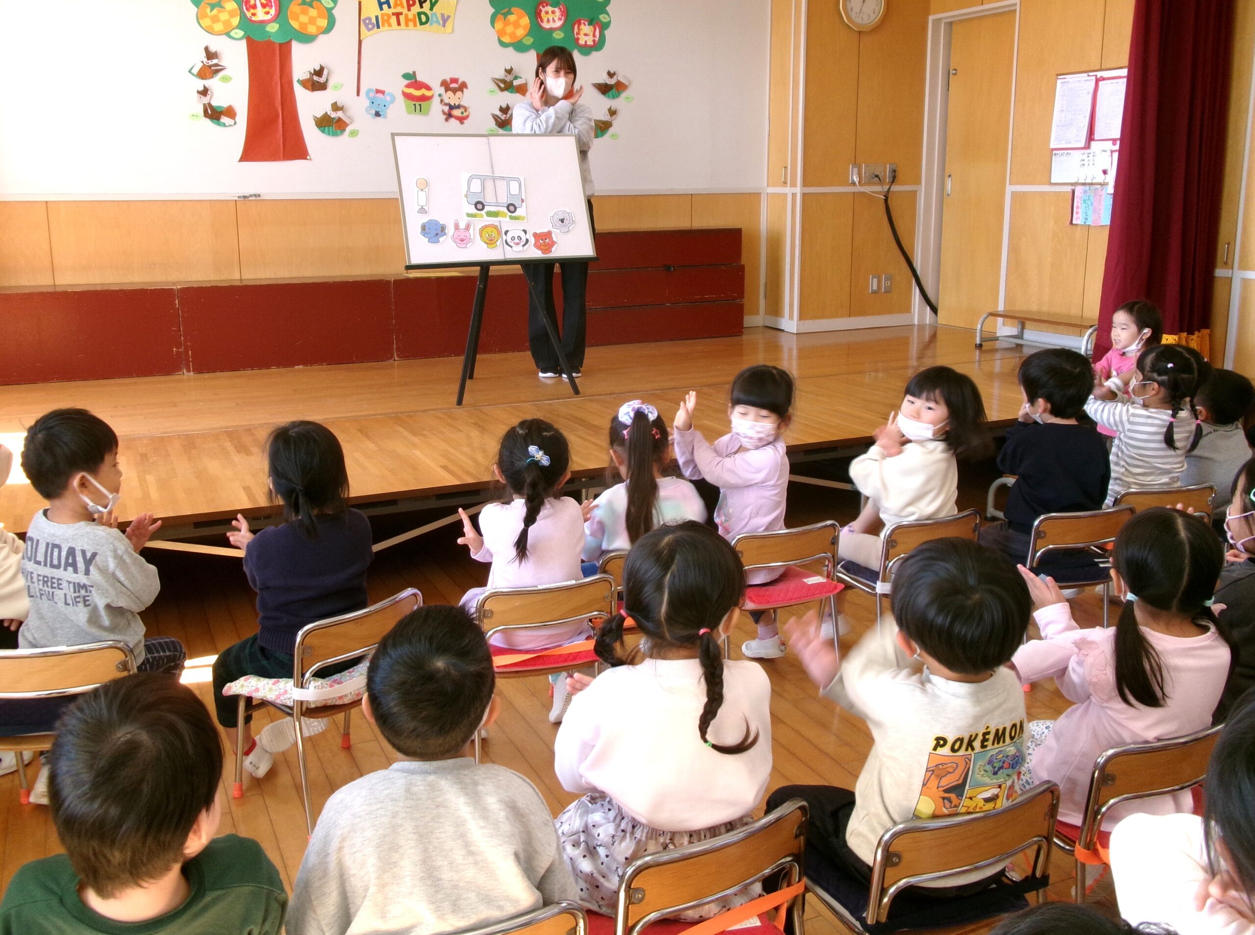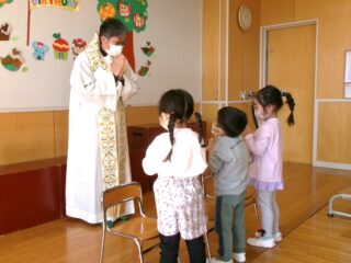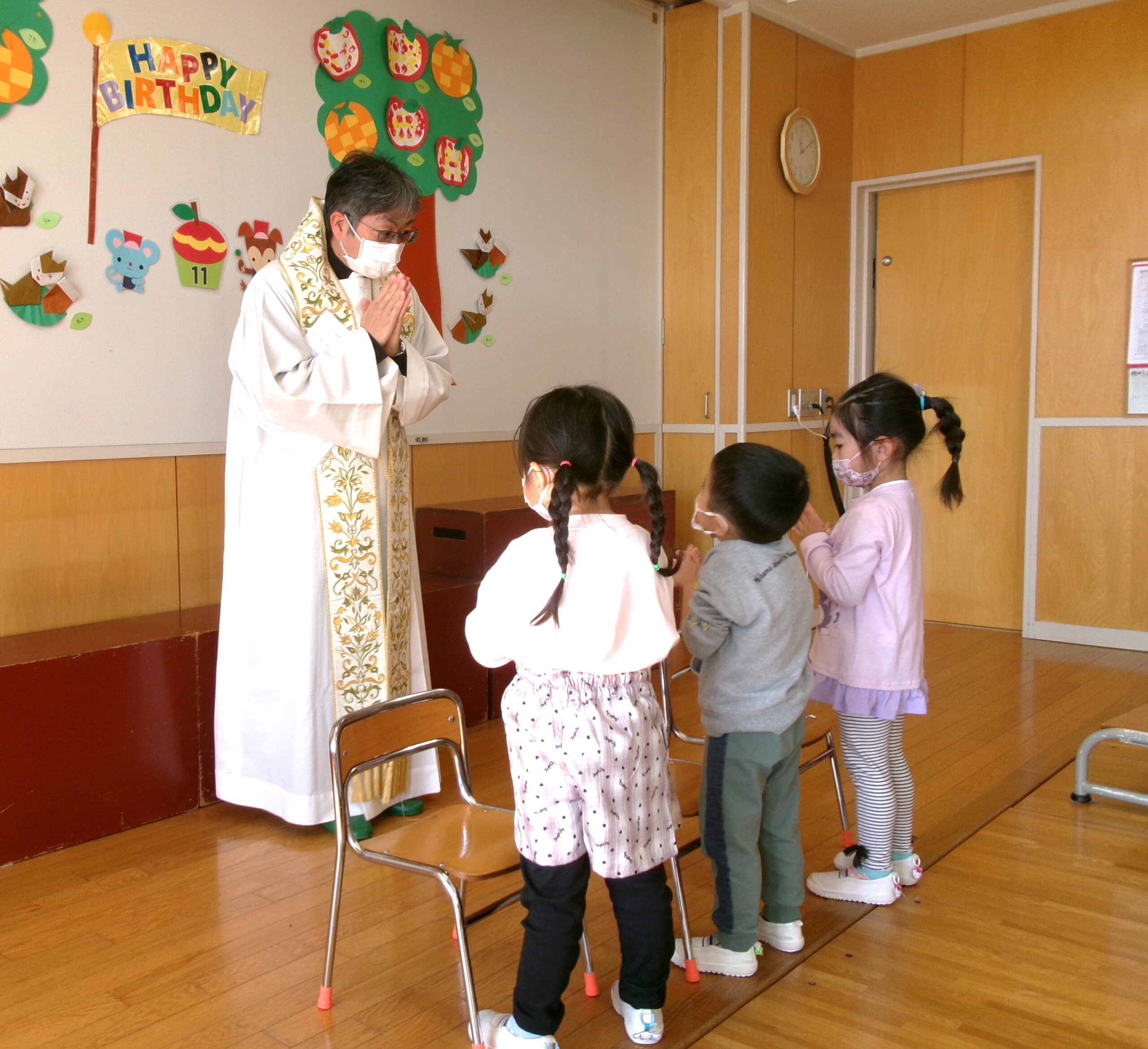 11月のお誕生日会 2025.11.25 お誕生日会の様子です。 かとう りんなさん(11月13日) 5さいのおたんじょうびおめでとうございます☆ なぐも ことさん(11月18日) 4さいのおたんじょうびおめでとうございます☆ ※写真はクリック、タップしてご覧ください 神父さまに祝福していただきました。 インタビューや園長先生からお誕生日カードもいただきました♪ 先生たちからは、パネルシアター【バス遠足、誰?誰?クイズ】でした☆ < 前へ
